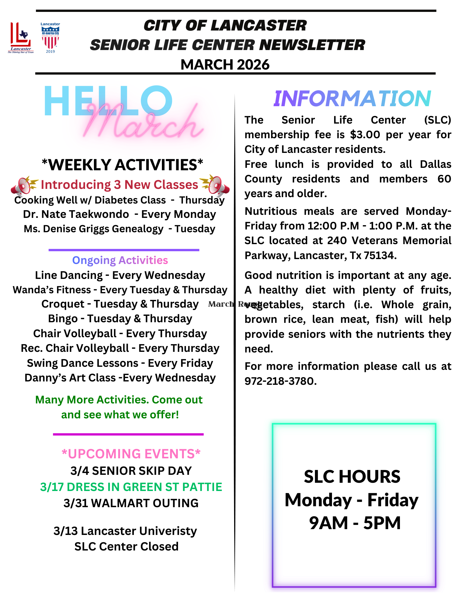 All new members will have receive a FREE Lancaster Senior Life Center t-shirt, and will have the opportunity to participate in classes, special programs, events, build new friendships, and live life to its fullest.